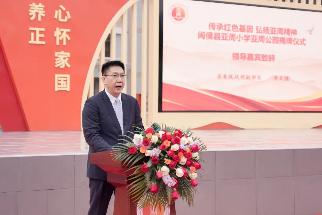 福州大学党委副书记王向阳致辞,他表示,自2010年福州大学与亚周小学共建以来,校友情缘持续深化。今天不仅是为公园剪彩,更是为这份跨越时空的校友精神与家国情怀致敬。他希望同学们站在先辈精神的基石上,以亚周先生、陈聪聪校长等前辈为榜样,汲取爱国、拼搏、担当与奉献的精神力量。珍惜时光,勤学修身,努力成为母校的骄傲、国家的栋梁。福州大学也将继续深化与亚周小学的合作,在科教文化等领域持续支持学校的发展,与大家携手将亚周小学建设为传承精神、培养新人的标杆,共同续写双向奔赴的育人新篇章。