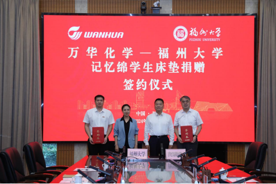 9月12日上午,万华化学-福州大学捐赠签约仪式在福州大学旗山校区举行。万华化学集团总裁、万华化学福建董事长寇光武,福州大学校长、中国工程院院士吴明红,福州大学副校长王心晨出席捐赠仪式。捐赠仪式由福州大学学生工作部(处)部(处)长张红主持。福州大学副校长王心晨与万华化学集团高级顾问赵继德代表校企双方签署了万华化学-福州大学床垫捐赠协议。校长吴明红院士代表学校接受万华化学捐赠的床垫样品,同时向寇光武总裁颁发了捐赠证书和纪念品。