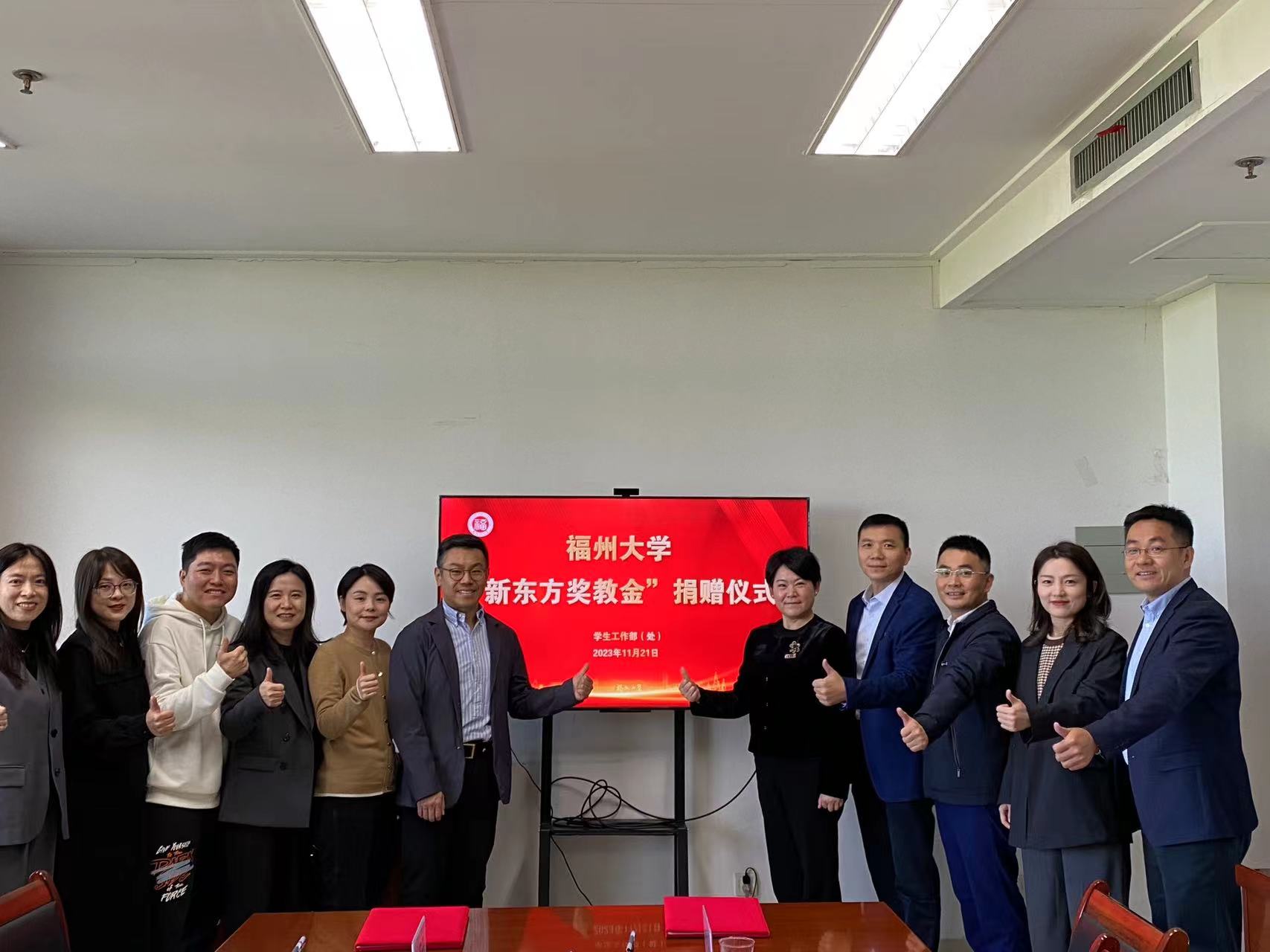 11月21日上午,由福州大学教育发展基金会主办、学生工作部(处)承办的福州大学“新东方奖教金”捐赠签约仪式在旗山校区行政北楼西305会议室举行。新东方教育科技集团助理副总裁兼福州学校校长毛成轶等一行六人,福州大学学生工作部(处)部(处)长张红、福州大学教育发展基金会理事长兰荣嵩等共同出席本次捐赠仪式。捐赠仪式由学生工作部(处)副部(处)长柯江锋主持。