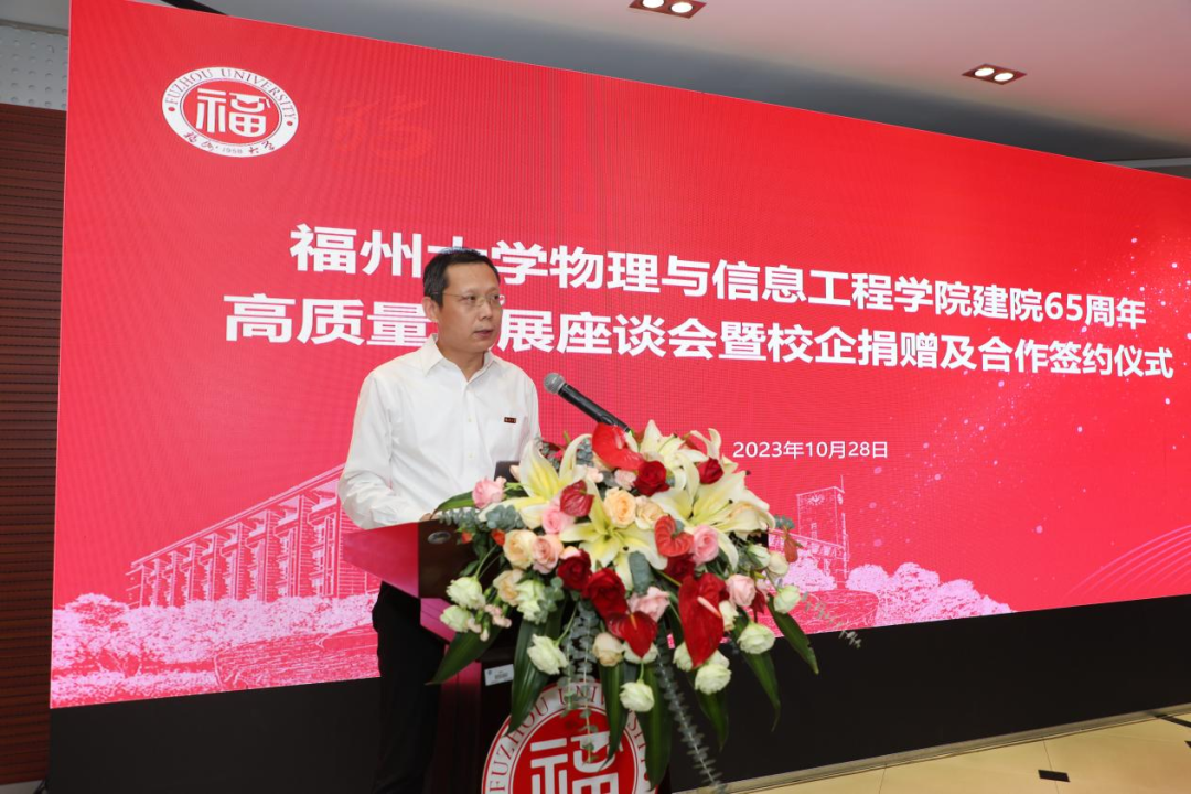 10月28日下午,福州大学物理与信息工程学院建院65周年高质量发展座谈会暨校企捐赠及合作签约仪式在物信南楼祥联厅举行。出席会议的有应邀参加建校65周年校庆活动的各位校友代表、捐赠合作企业代表、学院党政领导、师生代表等近40余人。会议由院党委副书记郑志刚主持。