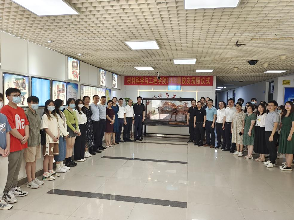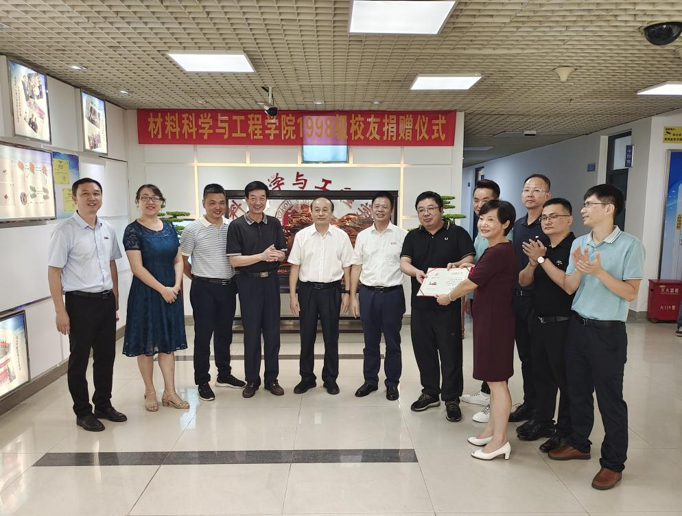 9月16日上午,材料科学与工程学院在学院实验楼一楼大厅举行1998级校友捐赠仪式,1998级校友代表余永德、陈丁山、叶铭、葛旭东、陈剑、材料学院首任院长陈文哲教授、校党委统战部林新辉部长、校国有资产管理处叶志清处长、院党委倪朝霞书记、院长张久俊院士、袁佩执行院长、林枞副院长、林梅金副院长、邵艳群工会主席莅临捐赠仪式,各教工党支部书记、学生代表共同见证,由学院党委张志忠副书记主持仪式。