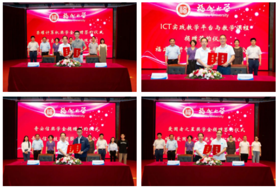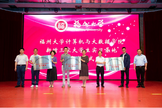 奋楫扬帆正当时,踔厉奋发谱新篇。时值福州大学计算机系成立四十周年,软件学院成立二十周年,计算机与大数据学院成立一周年,在这特殊的一年,为支持福州大学计算机与大数据学院(软件学院)的人才培养和高质量发展,进一步推进学院教学实习与就业实践基地建设,增强校企合作,推动产学研深度融合,同时也作为学院院庆的系列活动,5月30日晚,计算机与大数据学院在图书馆博学厅举行社会捐赠签约及大学生实习基地授牌仪式。