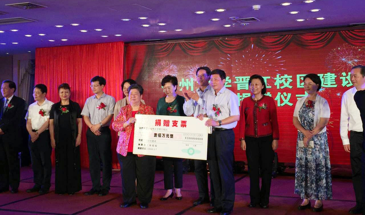 2016年5月7日,福州大学晋江科教园建设资金捐赠仪式在晋江金井举行。仪式由晋江市市长刘文儒主持,泉州市委常委、晋江市市委书记李建辉致辞。出席本次仪式的领导有:中央人民政府驻香港联络办公室主任张晓明、全国政协港澳台侨委员会副主任华建、中共福建省委常委、省委统战部部长雷春美、福建省人大副主任刘群英、河南省政协副主席孔玉芳、浙江省高级法院院长陈国猛、原福建省人大副主任陈营官同志、原福建省政协副主席潘心城同志、原福建省政协副主席叶继革同志、中共泉州市委书记郑新聪、福建省侨办主任杨辉、福建省侨联主席王亚君、福建省侨联党组书记陈世海、上海市文创办常务副主任陈跃华、全国政协委员、湖北省司法厅副厅长李仁真、福建省妇联副主席李凤鸣、原菲律宾外交部副部长周清琪、全国政协常委李羚、香港福建社团联会主席吴良好、香港福建社团联会荣誉主席李广兆,参加仪式的还有海内有关领导和嘉宾。