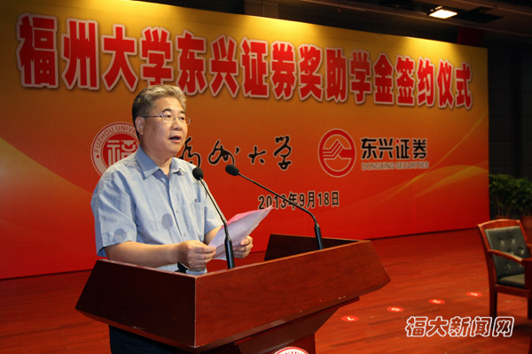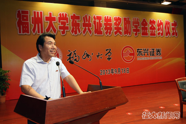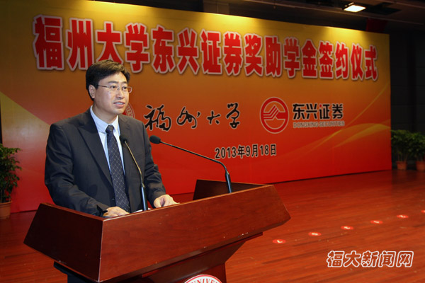 仪式最后,东兴证券党委副书记、总经理魏庆华发表讲话。他指出,东兴证券作为有社会责任感的国有控股证券公司,在为国家创造可观经济效益的同时,始终不忘回馈社会。他强调,教育事业是一项功在当代、利在千秋的宏伟事业。东兴证券这次与福大共同举办这个奖助学项目,既是对省政府领导倡导企业界捐资助学的积极响应,也是对省内教育界长期以来为东兴证券培养输送人才的感恩回馈。
