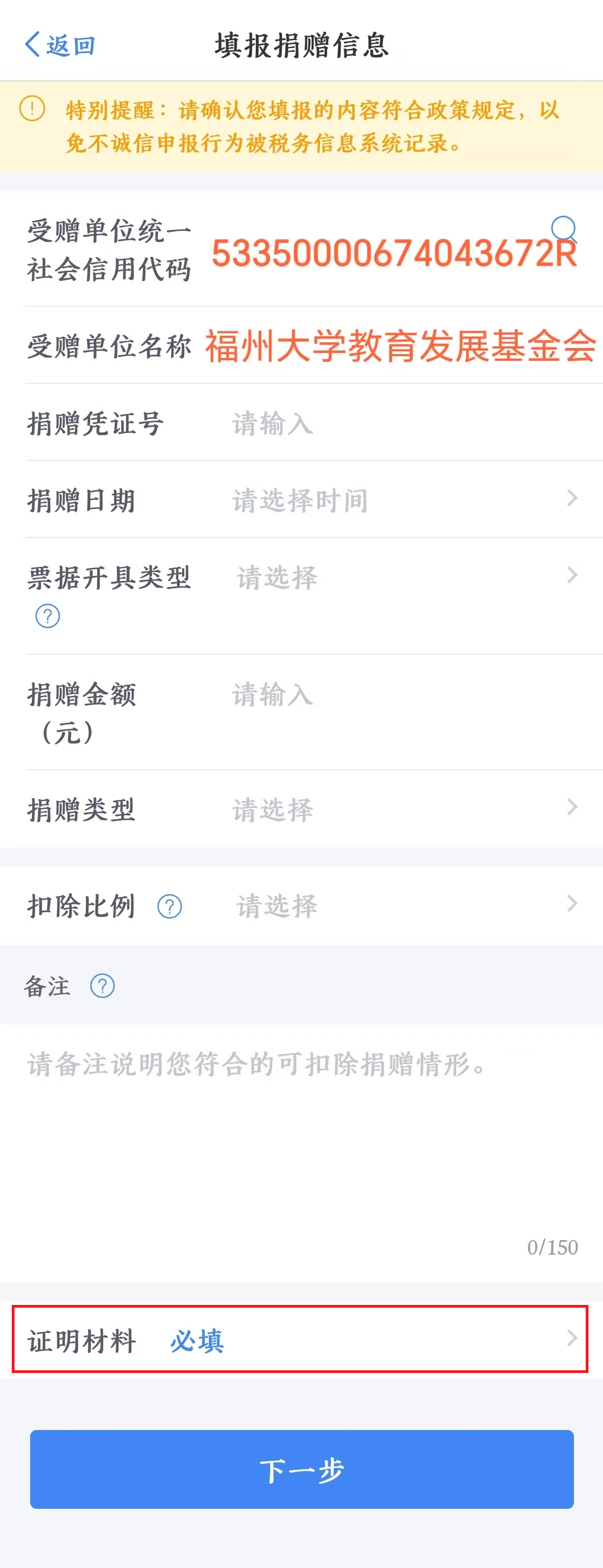捐赠人进入“个人所得税”APP,点击“综合所得年度汇算”,选择“申报年度——2025年度”并点击“开始申报”,完成“标准申报须知”确认。在进行个人所得税综合所得汇算清缴页面,点击准予扣除的捐赠额中进行新增,填写受赠单位福州大学教育发展基金会的统一社会信用代码、捐赠凭证号、捐赠金额和扣除比例选择30%(相关单位名称和代码信息见下图),捐赠备注可不填写,直接点击【下一步】。如您有多份捐赠,可继续点击“新增”添加。所有捐赠信息填妥后,点击“返回”个人综合所得年度汇算页面,即可继续办理汇算。